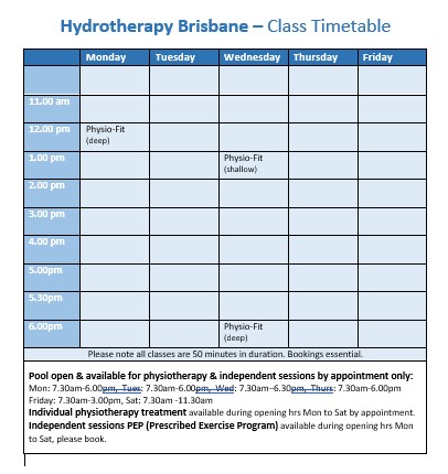 Hydrotherapy Brisbane offer a number of aquatic exercise classes to suit all abilities. These classes are run by qualified physiotherapists & exercise professionals. We do however recommend that if you have a specific problem (eg back, hip or knee pain) the best evidence based approach is to initially see a physiotherapist individually to get a program designed for your needs. The physio will suggest when it is appropriate that you start classes. Classes are generic – so cannot provide the best outcome for everyone all of the time.